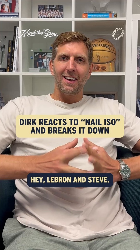 诺维茨基说:“嗨,勒布朗和史蒂夫,感谢你们对我的夸赞。这个甲区单打起始于对手球队在面对我的挡拆时大量换防,等我面对小个球员运球卷切到三秒区内时,另一个防守人会从弱侧换防回来。这样你的进攻时间所剩无几,但等我转身过后,我的身边还有一个大个防我。