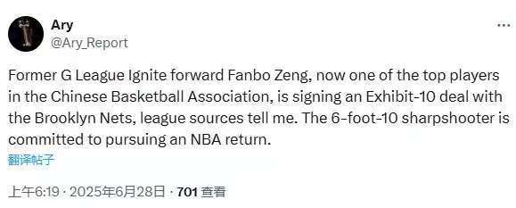 Ary在6月28日早上6:19宣布曾凡博与篮网签下一份E10合同,记者Rob Murrows一分钟后发布并被多个媒体转发,不久后Ary删除了这一报道。