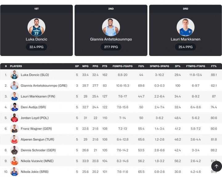 小组赛得分榜,东契奇场均32.4分傲视群雄,字母哥小组赛场均得分排名第二,命中率更是来到夸张的69.6%。