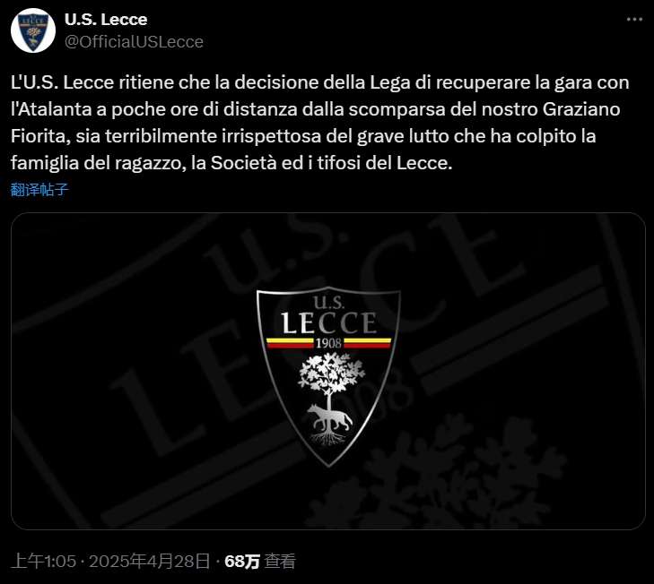 莱切足球俱乐部认为,意甲联盟决定在格拉齐亚诺-菲奥里塔(我们的成员)逝世仅数小时后便安排与亚特兰大的补赛,这种行为严重无视了俱乐部、这位年轻人的家庭以及莱切球迷所承受的巨大悲痛。