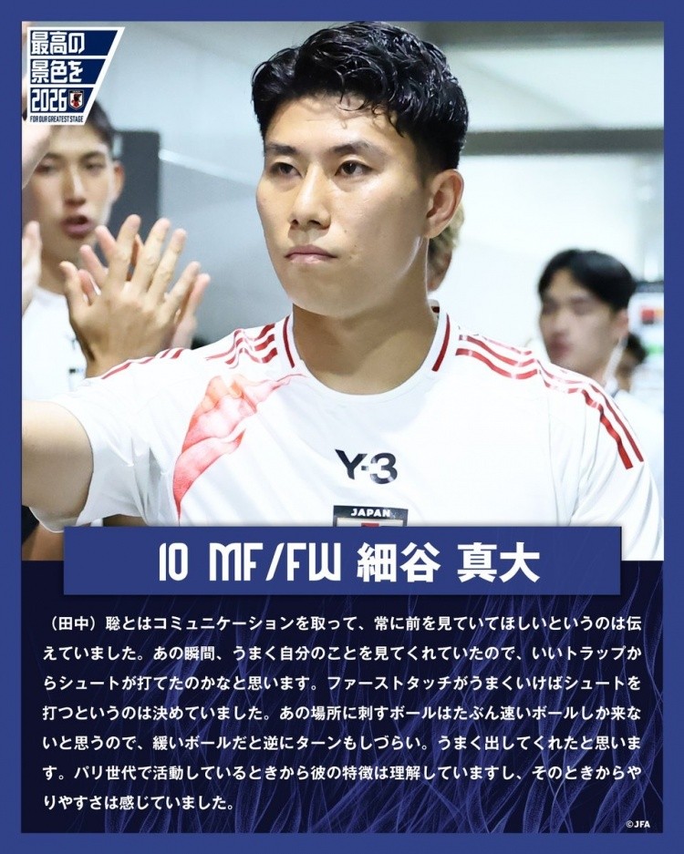 “我跟田中聪沟通过,希望他一直保持向前看。那一刻,他很好地关注到了我的位置,所以我觉得我才能完成那次漂亮的停球,然后起脚射门。”