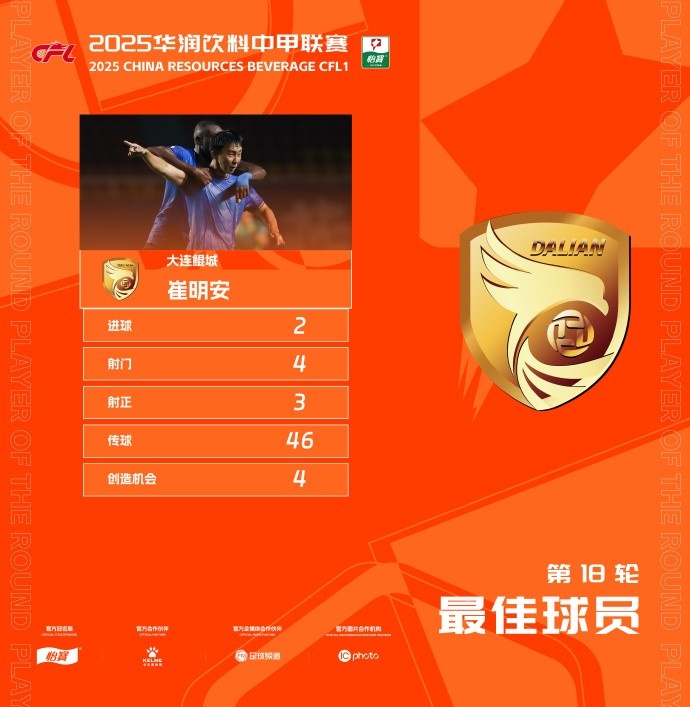 7月31日讯 分钟内连入两球帮助大连鲲城完成逆转的崔明安,当选为中甲第18轮最佳球员。